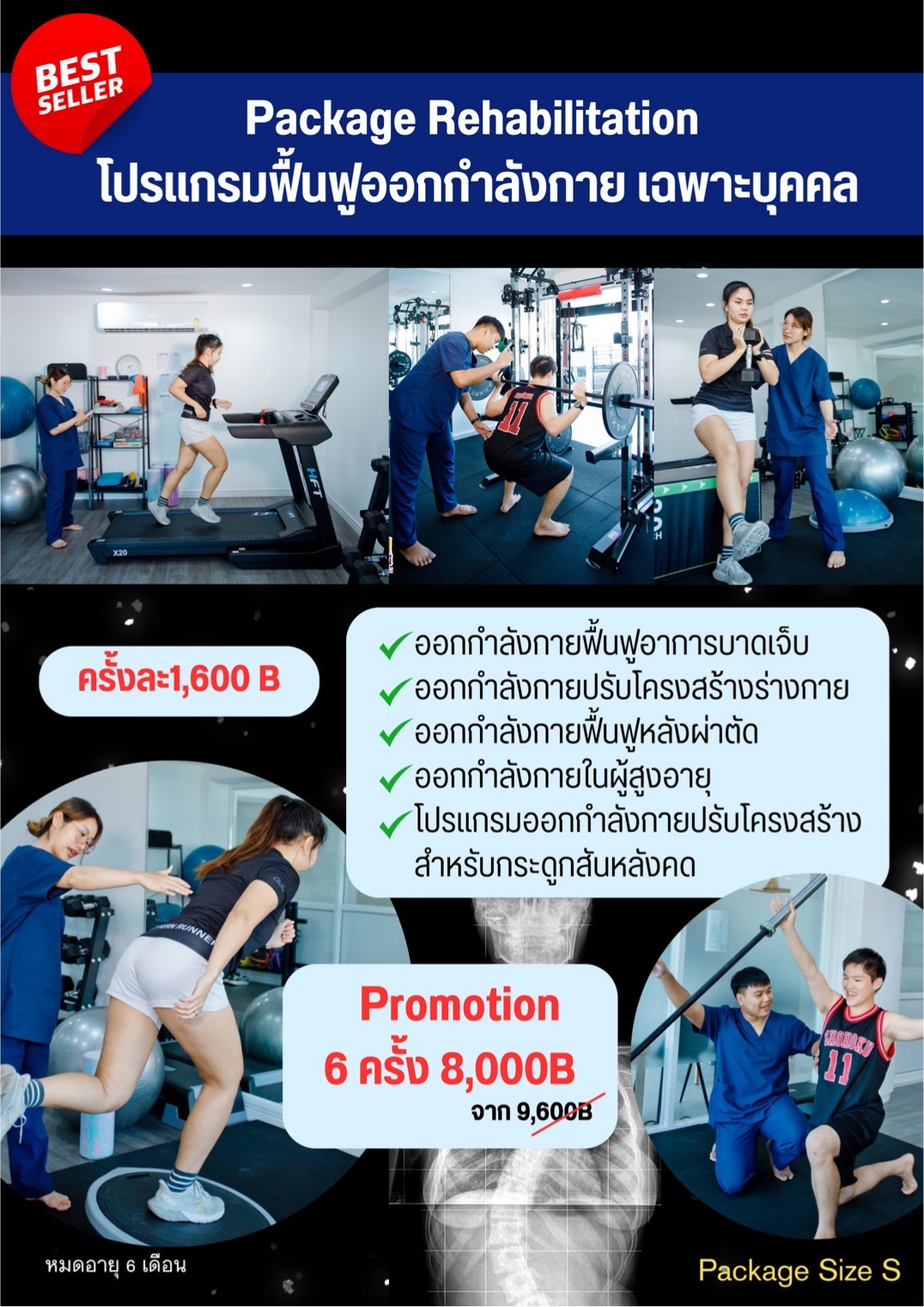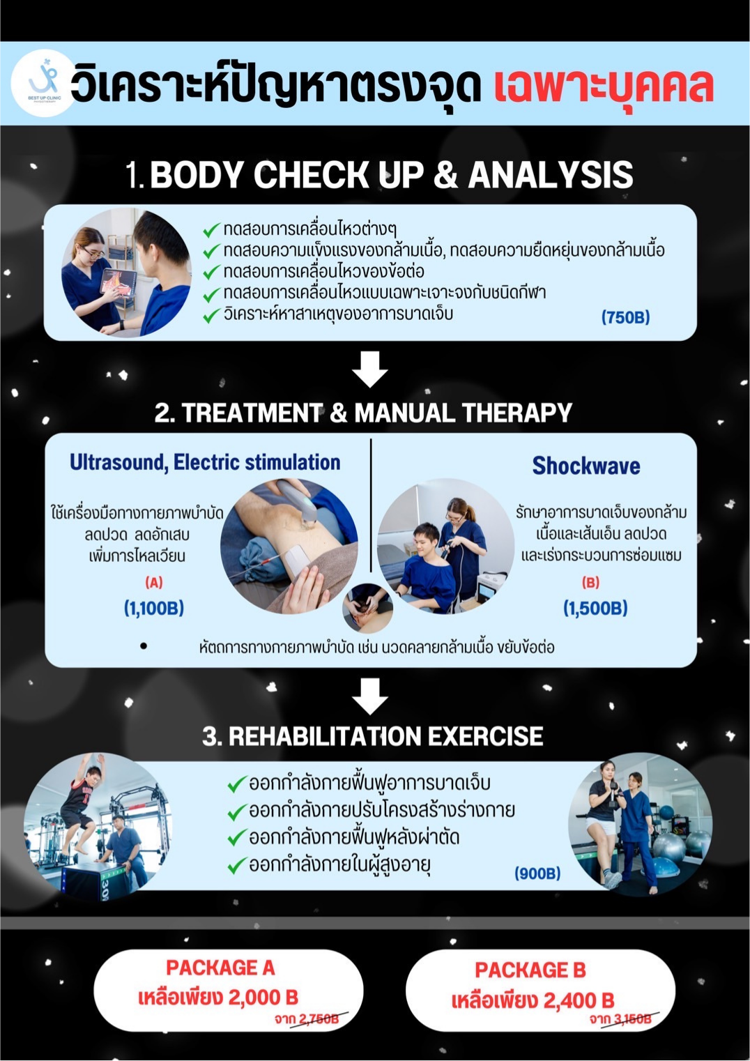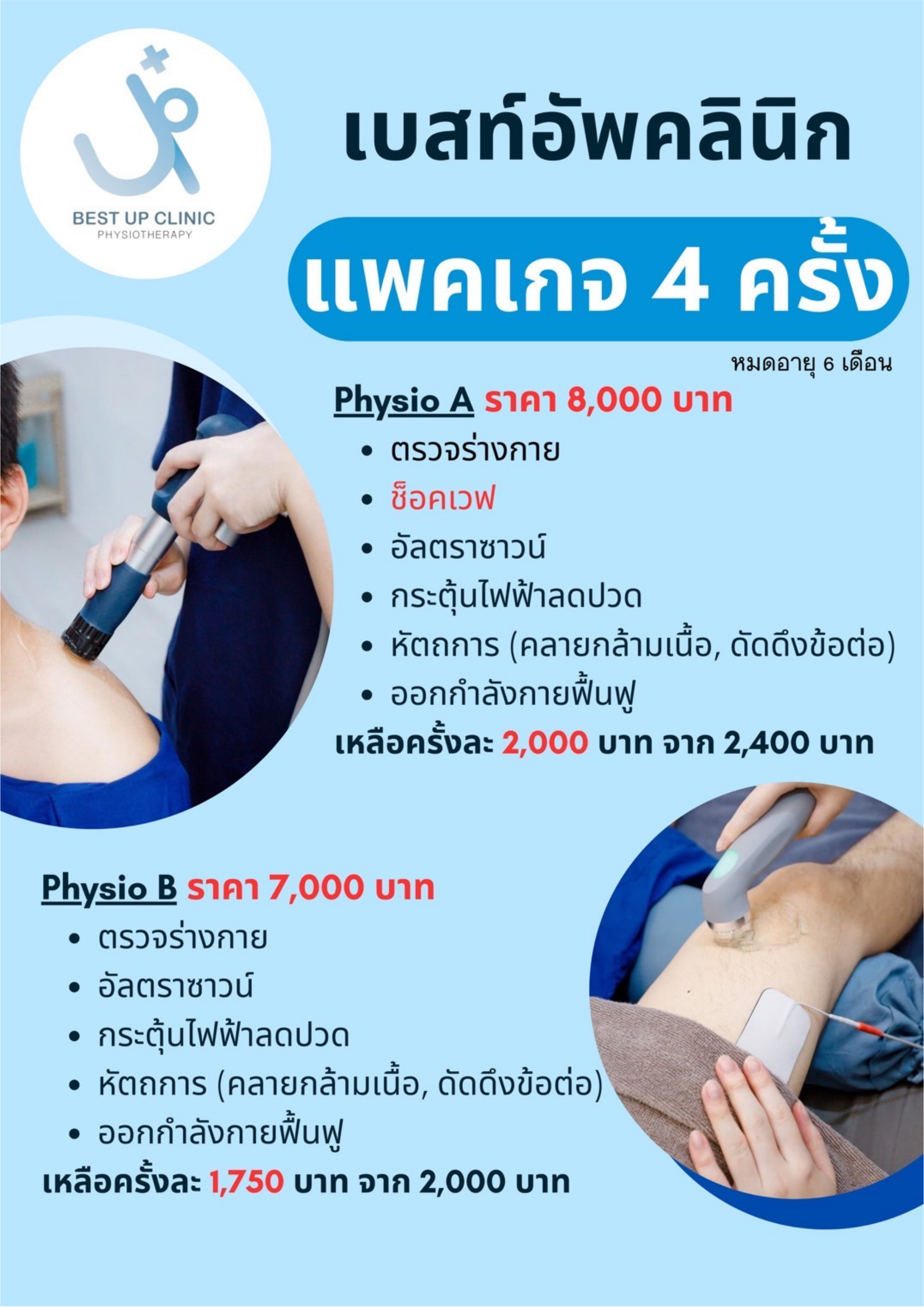 โดยมีนักกายภาพแนะนำสอนท่าออกกำลังกาย / ท่าบริหาร ลดปวด เพิ่มการเคลื่อนไหว เพิ่มความแข็งแรง พร้อมดูแลรักษาลูกค้าทุกคน